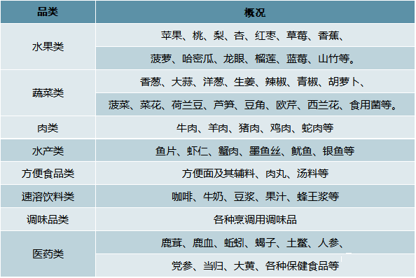 市場(chǎng)上已有的凍干產(chǎn)品包括蔬菜類、水果類、肉禽類、水產(chǎn)品類、方便食品類、飲料類、調(diào)味料類、保健食品類、食品工業(yè)原料類及其他制品。