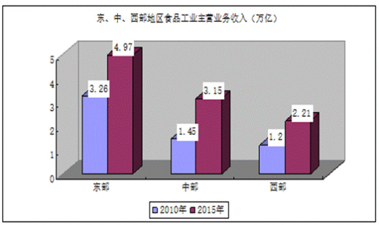 “十二五”期間,東部地區(qū)繼續(xù)保持了領(lǐng)先和優(yōu)勢的地位,2015年東部地區(qū)實(shí)現(xiàn)食品工業(yè)主營業(yè)務(wù)收入4.97萬億元,比2010年的3.26萬億元增長52.5%;中部地區(qū)借助農(nóng)業(yè)資源優(yōu)勢,努力將其轉(zhuǎn)化為產(chǎn)業(yè)優(yōu)勢,食品工業(yè)快速發(fā)展;2015年中部地區(qū)實(shí)現(xiàn)食品工業(yè)主營業(yè)務(wù)收入3.15萬億元,比2010年的1.45萬億元增長117.2%;西部地區(qū)借助政策優(yōu)勢,食品工業(yè)發(fā)展進(jìn)入快車道,2015年西部地區(qū)實(shí)現(xiàn)食品工業(yè)主營業(yè)務(wù)收入2.21萬億元,比2010年的1.20萬億元增長84.2%;東北地區(qū)實(shí)現(xiàn)食品工業(yè)主營業(yè)務(wù)收入1.27萬億元,比2010年的0.91萬億元增長39.6%。