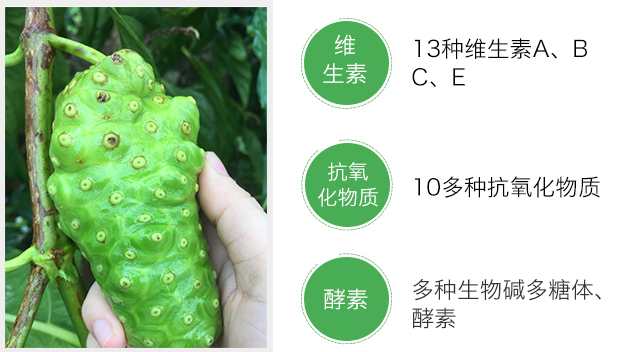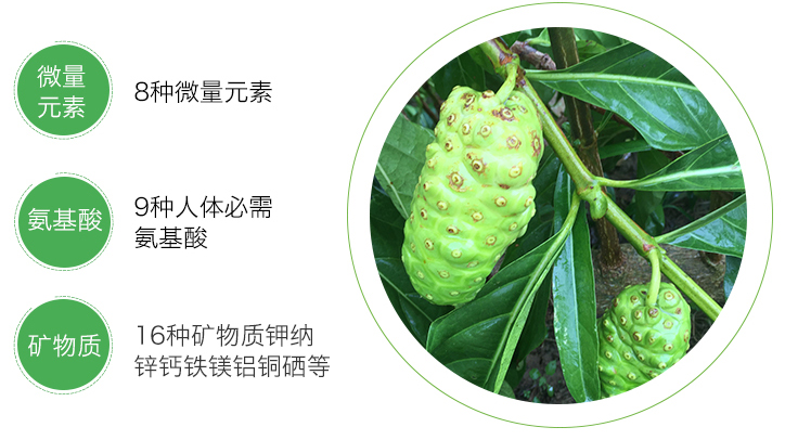 ![]() 諾麗果被稱為果中之王,是和它富含227種營養(yǎng)成分密切相關(guān)。包括13種維生素(A、B、C、E等),16種礦物質(zhì)(鉀、鈉、鋅、鈣、鐵、鎂、磷、銅、硒等),8種稀有元素,包括9種人體必需的氨基酸在內(nèi)的20多種氨基酸(是植物中含氨基酸種類最多的超強(qiáng)組合),10多種具抗氧化作用的物質(zhì)。諾麗果還含有多種生物堿、多醣體、多種酵素等極具醫(yī)學(xué)價(jià)值的成分。有生物專家提出,如果三種重要的植物性營養(yǎng)素類別多醣體、抗氧化劑、生物堿同時(shí)大量出現(xiàn)在一個(gè)天然植物果實(shí)中,就可說是革命性發(fā)現(xiàn)。