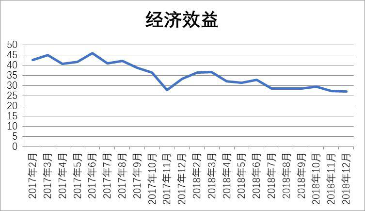 2018年第一季度增加值增速及產(chǎn)量增速相較2017年均有較大程度增長,從第二季度開始,受煙草增加值負增長的影響,發(fā)展水平指數(shù)持續(xù)下滑,到2018年12月有小幅上漲。 2、經(jīng)濟效益 2018年食品工業(yè)經(jīng)濟效益相較2017年有所下滑,第一季度較2017年有所增長,從4月開始有所下降,后三季度保持平穩(wěn)。