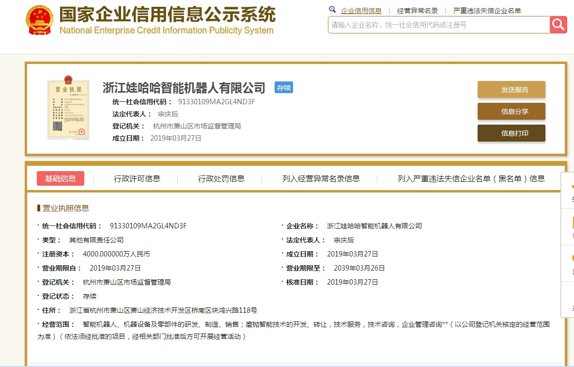 娃哈哈成立智能機(jī)器人公司,宗慶后任董事長!娃哈哈商業(yè)股份有限公司新成立了一家浙江娃哈哈智能機(jī)器人(19.680, 0.58, 3.04%)有限公司。 根據(jù)企查查數(shù)據(jù)顯示,浙江娃哈哈智能機(jī)器人有限公司成立于2019年3月27日,注冊資本4000萬元人民幣。娃哈哈商業(yè)股份有限公司為大股東,占股65%。 資料顯示,宗慶后為該公司最終受益人并出任董事長,持股比例52.15%。經(jīng)營范圍包括智能機(jī)器人、機(jī)器設(shè)備及零部件的研發(fā)、制造、銷售等。