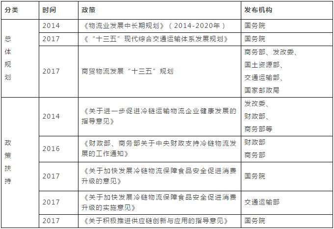 二、我國冷鏈物流發(fā)展現(xiàn)狀 (一)國家政策大力支持 近年來,政府層面高度重視冷鏈物流的發(fā)展。僅2017年,國家層面上先后制定出臺了《“十三五”現(xiàn)代綜合交通運(yùn)輸體系發(fā)展規(guī)劃》《商貿(mào)物流發(fā)展“十三五”規(guī)劃》《關(guān)于加快發(fā)展冷鏈物流保障食品安全促進(jìn)消費(fèi)升級的意見》《關(guān)于加快發(fā)展冷鏈物流保障食品安全促進(jìn)消費(fèi)升級的實施意見》《關(guān)于積極推進(jìn)供應(yīng)鏈創(chuàng)新與應(yīng)用的指導(dǎo)意見》《關(guān)于提升餐飲業(yè)質(zhì)量安全水平的意見》等文件,推出了農(nóng)產(chǎn)品冷鏈流通標(biāo)準(zhǔn)化示范城市及企業(yè)試點(diǎn)、評估等活動,從政策、法規(guī)、行業(yè)標(biāo)準(zhǔn)等角度推動了整個物流行業(yè)轉(zhuǎn)型升級,為冷鏈物流行業(yè)發(fā)展提供了積極的政策環(huán)境。(見表3)