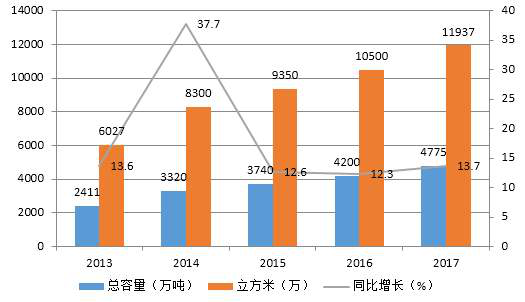 圖3 2013-2017年我國冷庫總?cè)萘吭鲩L變化圖