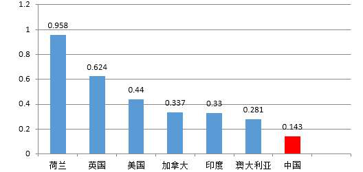 圖10 2016年各國城市居民人均冷庫占有量對比(單位:立方米/人)