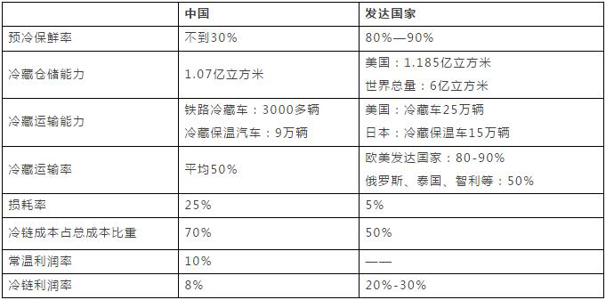 (三)冷鏈物流成本比較 當(dāng)前,我國每年約有20%—25%的果品和30%的蔬菜在中轉(zhuǎn)運(yùn)輸及存放中腐爛損壞,損壞總量每年高達(dá)上億噸,價值高達(dá)750億元。相比之下,歐美日等發(fā)達(dá)國家和地區(qū)實現(xiàn)了整個冷鏈管理環(huán)節(jié)的成本控制。(見表5) 表5 我國與發(fā)達(dá)國家冷鏈成本