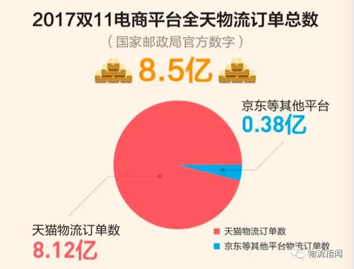 先從我們比較關(guān)心的物流數(shù)據(jù)說(shuō)起,其中特別具有代表性的就是中國(guó)快遞數(shù)據(jù): 2017年全國(guó)快遞業(yè)務(wù)量完成400.6億件,是2007年的33.4倍,十年間每年年均增長(zhǎng)42%。這一數(shù)量達(dá)到日本的10倍,占全球總量的一半。在2017年的400億快遞中68%來(lái)自服務(wù)電商,全年收入近5000億元,對(duì)全球包裹快遞增長(zhǎng)貢獻(xiàn)率超50%。 第三方機(jī)構(gòu)根據(jù)阿里2017財(cái)年(2016.4-2017.3)年報(bào)數(shù)據(jù)推測(cè):2017財(cái)年菜鳥(niǎo)網(wǎng)絡(luò)及其物流合作伙伴在零售市場(chǎng)共處理約166億個(gè)包裹。同期國(guó)內(nèi)快遞行業(yè)業(yè)務(wù)總量為331億個(gè),則菜鳥(niǎo)平臺(tái)業(yè)務(wù)量占行業(yè)總比例約為50.15%。所以,菜鳥(niǎo)平臺(tái)體量獨(dú)占中國(guó)快遞的半壁江山。 從2017年雙11的物流數(shù)據(jù)看,菜鳥(niǎo)的物流承載能力已經(jīng)成為了中國(guó)電商核心載體。如圖: