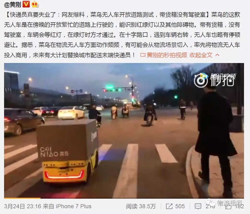 3月24日的最新消息,菜鳥(niǎo)的無(wú)人配送車輛已經(jīng)在大街上開(kāi)始測(cè)試了。菜鳥(niǎo)的這款無(wú)人車是在傍晚的開(kāi)放繁忙的道路上行駛的,能識(shí)別紅綠燈以及其他障礙物。帶有貨箱,沒(méi)有駕駛室,車輛會(huì)等紅燈,在綠燈時(shí)方才通過(guò)。在十字路口,遇到車輛右轉(zhuǎn),無(wú)人車也略有停頓避讓。據(jù)悉,菜鳥(niǎo)在物流無(wú)人車方面動(dòng)作頻頻,有可能會(huì)從物流場(chǎng)景切入,率先將物流無(wú)人車投入商用。