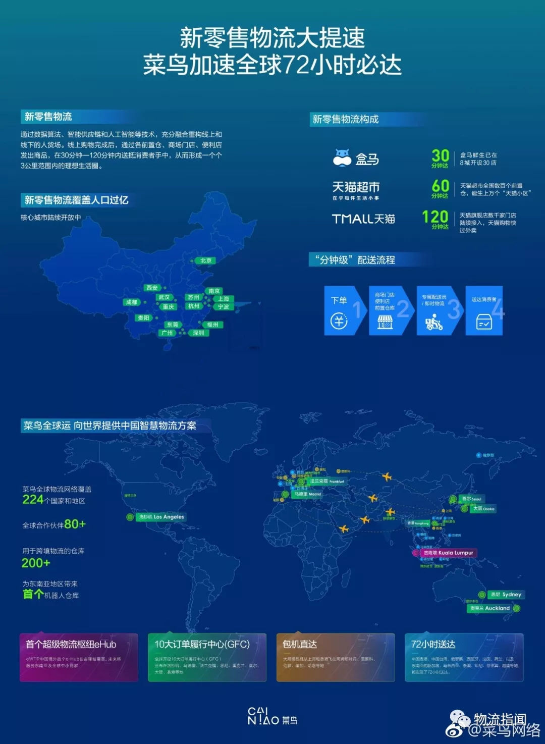 3.菜鳥(niǎo)網(wǎng)絡(luò)的多層網(wǎng)絡(luò)布局: 2017年全面菜鳥(niǎo)的布局來(lái)看,已經(jīng)初步實(shí)現(xiàn)了圍繞快遞、倉(cāng)配、國(guó)際、末端、農(nóng)村五張物流網(wǎng)絡(luò)建設(shè)。以零售通與菜鳥(niǎo)的合作為例,已經(jīng)實(shí)現(xiàn)了物流從大型區(qū)域倉(cāng),到城市倉(cāng),再到大型商超和萬(wàn)千小店的快速配送,打通了物流2B和2C模式,重塑了品牌“一盤貨”供應(yīng)鏈,實(shí)現(xiàn)了物流驅(qū)動(dòng)商業(yè)創(chuàng)新。 目前菜鳥(niǎo)的新零售物流已在全國(guó)數(shù)十個(gè)城市布局,覆蓋近1億人口,真正開(kāi)辟了新的物流賽道。這個(gè)賽道不是單一的快遞、不是單一的城市配送、不是單一的倉(cāng)儲(chǔ),也不是單一的最后一公里,是一條新零售的獨(dú)特的供應(yīng)鏈通路。