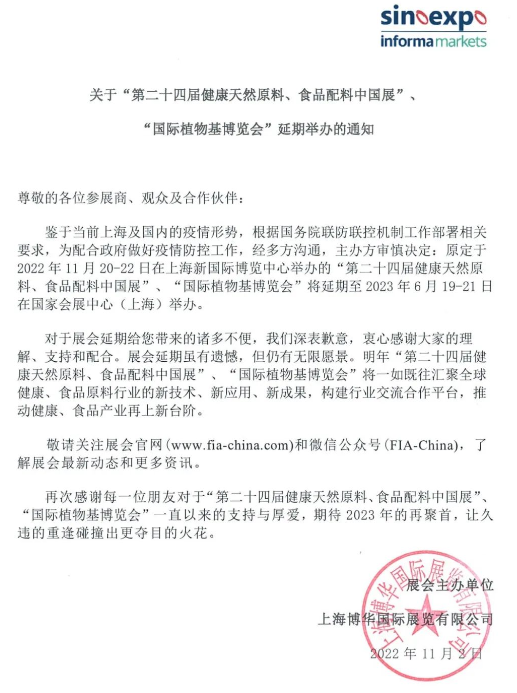 關(guān)于“第二十四屆健康天然原料、食品配料中國(guó)展”、“國(guó)際植物基博覽會(huì)”延期舉辦的通知