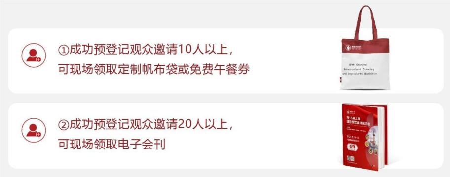 01 免門票,快速入場 本展會為專業(yè)餐飲食材展,現(xiàn)場參觀將收取200元門票。限時(shí)完成觀眾預(yù)登記,可免票參觀,并能簡化現(xiàn)場登記流程,快速入場; 02 多展聯(lián)動,一票全通 完成預(yù)登記的觀眾,可免費(fèi)參觀同期聯(lián)展,無需重復(fù)登記; 03 最新資訊,搶先掌握 預(yù)登記觀眾可通過微信公眾號、短信推送、小程序第一時(shí)間掌握展會最新消息,包括但不限于展會新聞、展商名錄、展品信息、活動資訊等;04 精準(zhǔn)配對,買賣對接