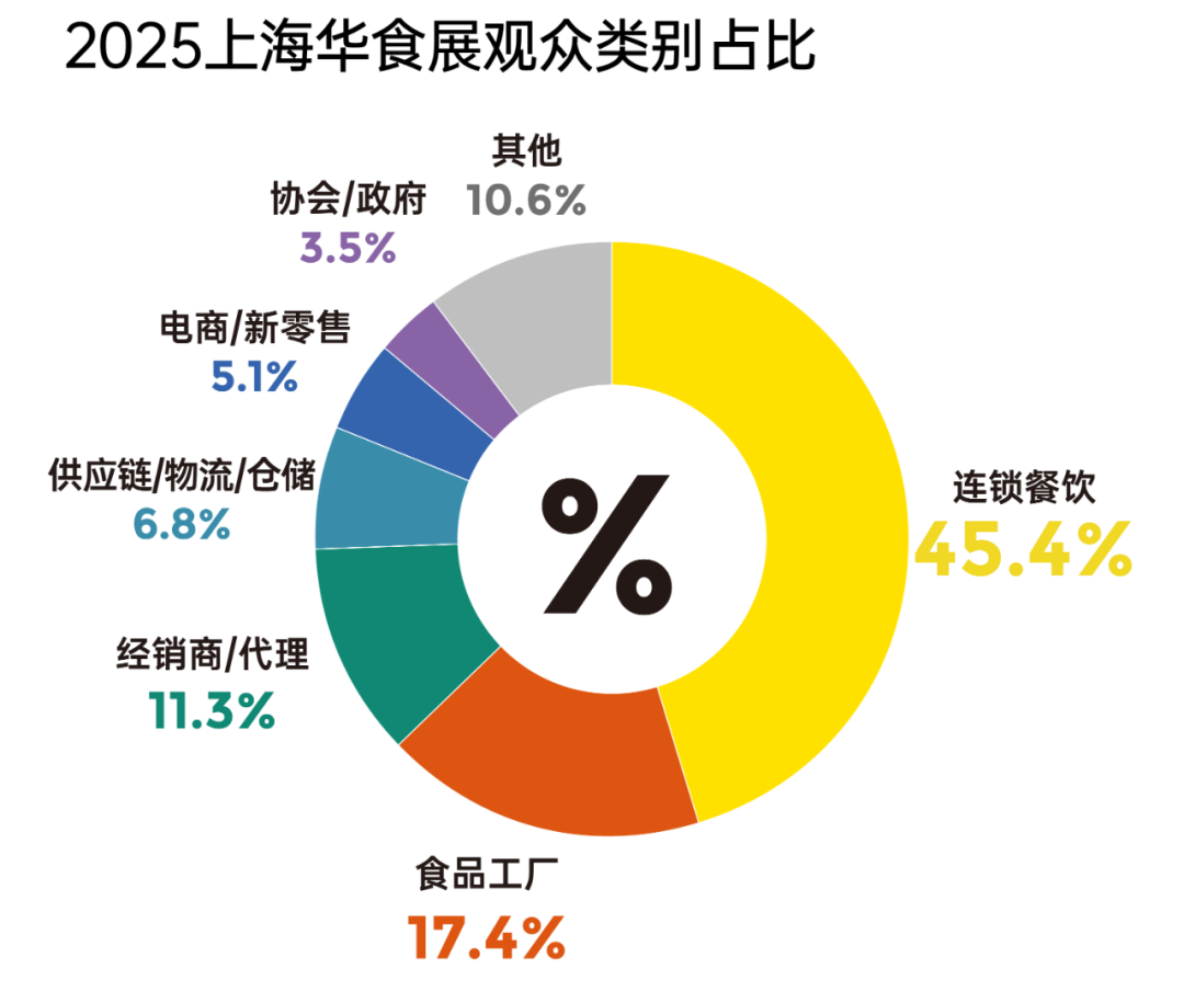 1 截至2024年9月全國(guó)門(mén)店規(guī)模為776.3萬(wàn)家,區(qū)域發(fā)展情況來(lái)看,華東占到近三分之一的市場(chǎng) 2 中國(guó)餐飲第一大區(qū)華東,門(mén)店規(guī)模占比達(dá)33.6% 3 中國(guó)餐飲第一大市上海,門(mén)店規(guī)模超20萬(wàn) 4 中國(guó)火鍋行業(yè)市場(chǎng)規(guī)模2024年為6,175億,同比增長(zhǎng)5.6%,預(yù)計(jì)2025年火鍋市場(chǎng)規(guī)模達(dá)到6,500億元 5 中國(guó)火鍋連鎖化率從2023年初的23~24%的區(qū)間逐步提升至超過(guò)25%的水平,且50家以上連鎖品牌比重逐步擴(kuò)大 信息來(lái)源:中國(guó)餐飲大數(shù)據(jù)白皮書(shū)、中國(guó)中式餐飲白皮書(shū)、紅餐大數(shù)據(jù) 2025上海華食展到場(chǎng)付費(fèi)專(zhuān)業(yè)觀眾100,325人,其中華東三省一市(上海、江蘇、浙江、安徽)觀眾占比超66%,且連鎖餐飲觀眾類(lèi)別占比達(dá)45.4%。 ![]()