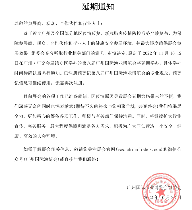 第八屆廣州漁業(yè)國際博覽會延期舉辦