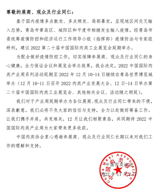 為配合做好疫情防控工作,切實保障參展商、觀眾及行業(yè)同仁的身心健康,全力保證會議和展覽會舉辦效果,我會決定,2022中國國際肉類產(chǎn)業(yè)周系列活動延期至2022年12月10-14日繼續(xù)在青島世界博覽城舉辦(12月10-11日召開2022肉類產(chǎn)業(yè)發(fā)展大會、同期展會布展;12日-14日舉辦第二十屆中國國際肉類工業(yè)展覽會、其他相關(guān)會議、活動隨之順延)。具體安排見通知。