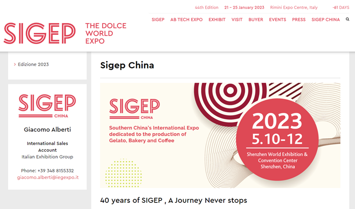 2022年3月15日,意大利展覽集團(tuán)與德國(guó)科隆展覽有限公司就SIGEP的中國(guó)展——SIGEP China達(dá)成戰(zhàn)略合作。首屆SIGEP China將于2023年5月10-12日在深圳國(guó)際會(huì)展中心(寶安新館)舉辦,SIGEP China致力于成為中國(guó)華南領(lǐng)先的冰淇淋、甜品烘焙和咖啡餐飲業(yè)的B2B展會(huì)。