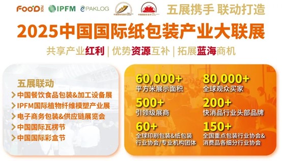 3.五展聯(lián)動(dòng),開啟紙包裝產(chǎn)業(yè)發(fā)展金渠道2025新布局之二,關(guān)聯(lián)產(chǎn)業(yè)大聯(lián)動(dòng)大勢(shì)所趨、順勢(shì)而動(dòng)——當(dāng)前“全球限塑“的時(shí)代背景下,”以紙代塑”已經(jīng)成為全球消費(fèi)品行業(yè)、包裝行業(yè)的大勢(shì)所趨。中國(guó)紙包裝專業(yè)展會(huì)、商貿(mào)、媒體平臺(tái)——美獅·華克與美印傳媒聯(lián)合旗下五大標(biāo)桿展會(huì)——中國(guó)餐飲食品包裝&加工設(shè)備展、IPFM國(guó)際植物纖維模塑產(chǎn)業(yè)展、電子商務(wù)包裝&供應(yīng)鏈展覽會(huì)、中國(guó)國(guó)際瓦楞節(jié)以及中國(guó)國(guó)際彩盒節(jié),打造中國(guó)國(guó)際紙包裝產(chǎn)業(yè)大聯(lián)展,大聯(lián)展以紙基包裝全產(chǎn)業(yè)鏈為核心,聚焦智能精益制造、原輔材料革新和制品創(chuàng)新設(shè)計(jì)應(yīng)用。餐飲食品包裝堪稱是在“全球限塑”大潮中,迎來(lái)最大變革的行業(yè)之一,也是紙基類產(chǎn)品應(yīng)用最為廣泛的市場(chǎng)之一,此時(shí)聯(lián)動(dòng)關(guān)聯(lián)產(chǎn)業(yè)正當(dāng)其時(shí)。此番多方聯(lián)動(dòng),產(chǎn)業(yè)、技術(shù)優(yōu)勢(shì)互補(bǔ),各方客戶資源共享,聯(lián)動(dòng)發(fā)掘食品飲料、餐飲烘焙、咖啡茶飲、農(nóng)產(chǎn)品、生鮮果蔬、電商平臺(tái)、零售商超等大消費(fèi)領(lǐng)域的應(yīng)用與商機(jī),開啟紙包裝產(chǎn)業(yè)高質(zhì)量發(fā)展的金渠道。