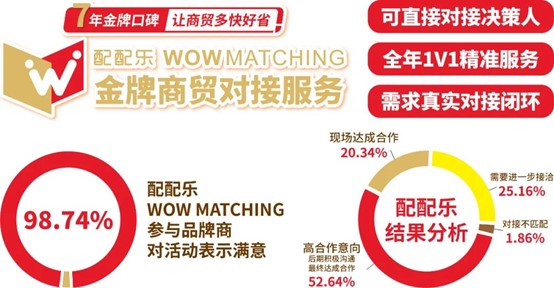 不僅限于展會(huì)期間,配配樂(lè)WOW MATCHING的商貿(mào)服務(wù)將貫穿2025展會(huì)周期,區(qū)域聯(lián)誼會(huì)、品牌探訪專場(chǎng)、行業(yè)沙龍、線上對(duì)接&云探訪……多元主題+多元模式,服務(wù)全年不間斷!讓展商參展收益最大化,觸達(dá)更多客戶資源、更多商機(jī)!