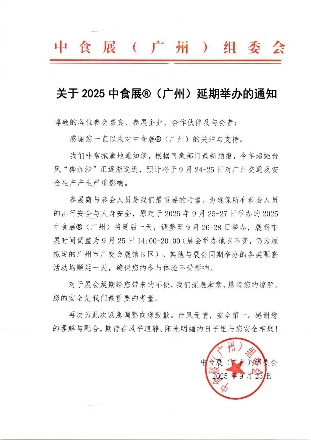關(guān)于2025中食展(廣州)延期舉辦的通知尊敬的各位參會(huì)嘉賓、參展企業(yè)、合作伙伴及與會(huì)者: 我們非常抱歉地通知您,根據(jù)氣象部門(mén)最新預(yù)報(bào),今年超強(qiáng)臺(tái)風(fēng)“樺加沙”正逐漸逼近,預(yù)計(jì)將于9月24-25日對(duì)廣州交通及安全生產(chǎn)產(chǎn)生嚴(yán)重影響。 參展商與參會(huì)人員的安全是我們最重要的考量,為確保所有參會(huì)人員的出行安全與人身安全,原定于2025年9月25-27日舉辦的2025中食展®(廣州)將延后一天,調(diào)整至9月26-28日舉辦,展商布展時(shí)間調(diào)整為9月25日14:00-20:00(展會(huì)舉辦地點(diǎn)不變,仍為原擬定的廣州市廣交會(huì)展館B區(qū))。其他與展會(huì)同期舉辦的各類(lèi)配套活動(dòng)均順延一天,確保您的參與體驗(yàn)不受影響。 對(duì)于展會(huì)延期給您帶來(lái)的不便,我們深表歉意,懇請(qǐng)您的諒解。您的安全是我們最重要的考量。 再次為此次緊急調(diào)整向您致歉。臺(tái)風(fēng)無(wú)情,安全第一。感謝您的理解與配合,期待在風(fēng)平浪靜、陽(yáng)光明媚的日子里與您安全相聚!